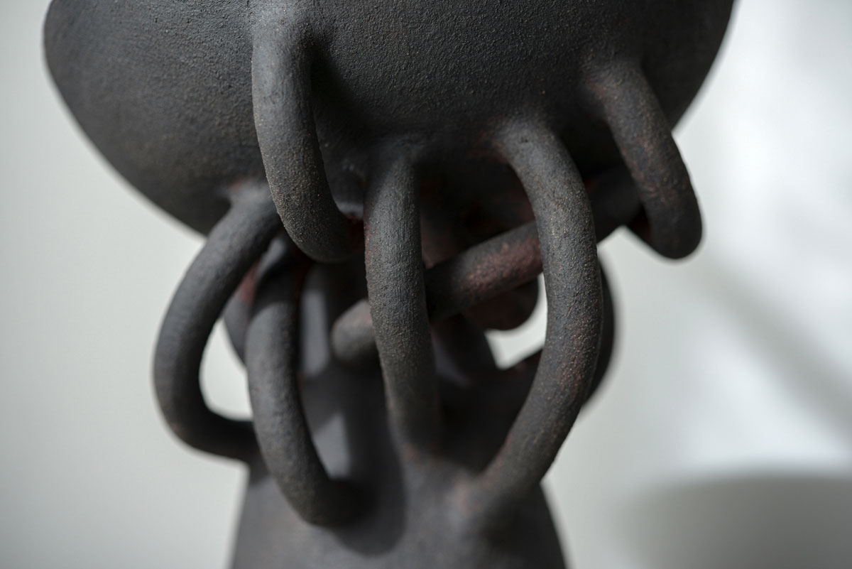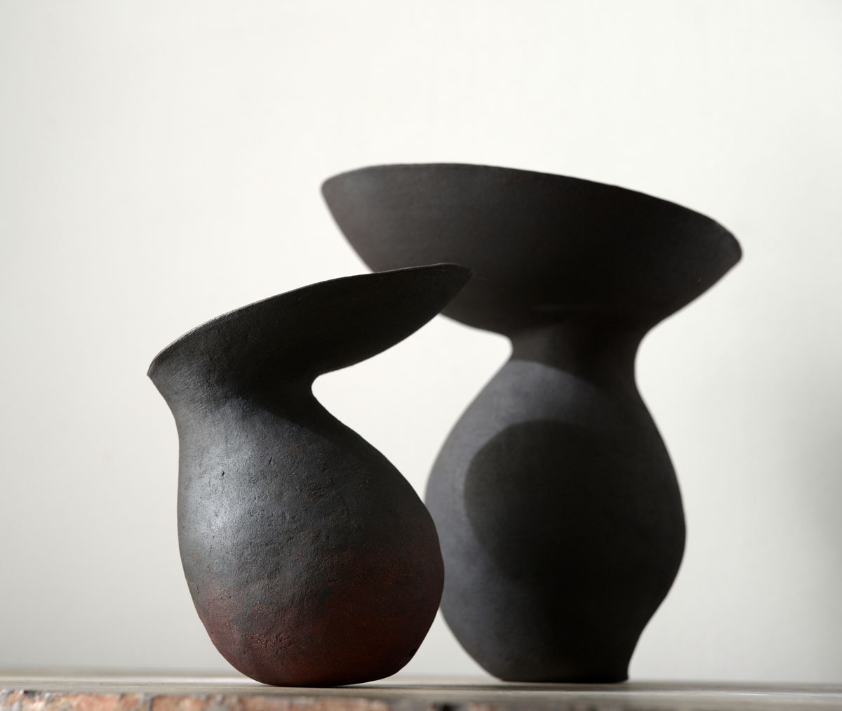 Les ouvertures des cruches et des vases sont parfois humanisées : elles expriment tantôt une bouche assoiffée, un cri, un chant, un apaisement. Quand elles ne sont pas en équilibre, les céramiques peuvent perdre leur anse et deviennent alors des corps de terres béants, d’où l’émail déborde à peine, s’étire en s’asséchant sur une terre brute et rugueuse…