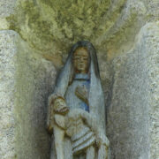 . Des sculptures en bois polychrome : saint Jean Baptiste avec agneau, saint Étienne pierre sur la tête, Vierge Marie enceinte (anciennement à la fontaine plus bas), Marie-Madeleine avec flacon de parfum (pas de tête, anciennement à l’Iliz Coz).